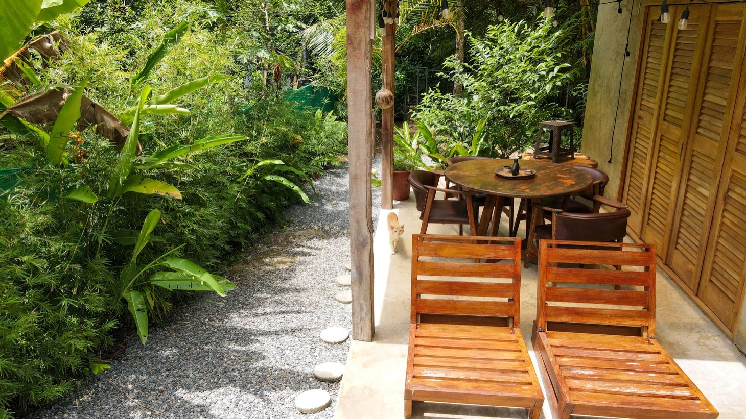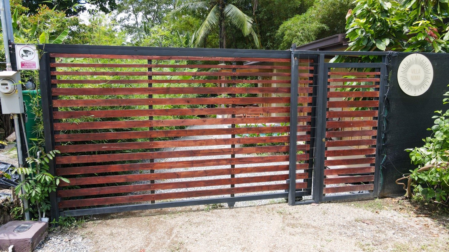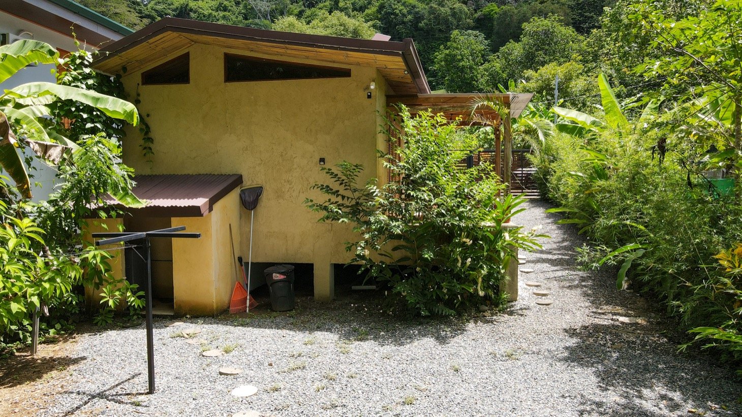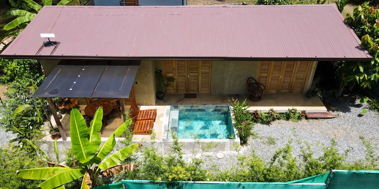 The home features two air-conditioned bedrooms, one full bathroom, and refined teak wood accents that add warmth and character to the interior. Built entirely with solid concrete blocks, the structure is topped with ceilings finished in traditional woven esterilla, lending an artisanal touch.