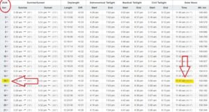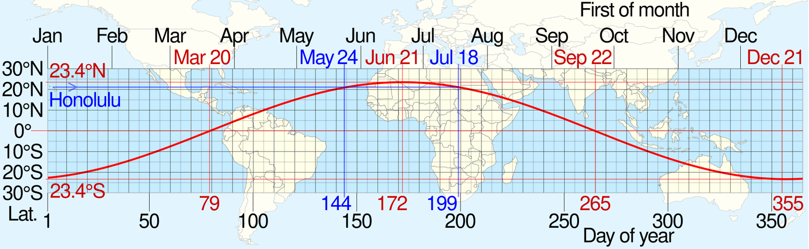 To find the Zero Shadow Days for your location, use the graphic below. Find your location on the map. Then move across to where its latitude intersects the red line that shows the sun’s declination. Then move up to read the dates. In the example, Honolulu’s dates are shown as May 24 and July 18.